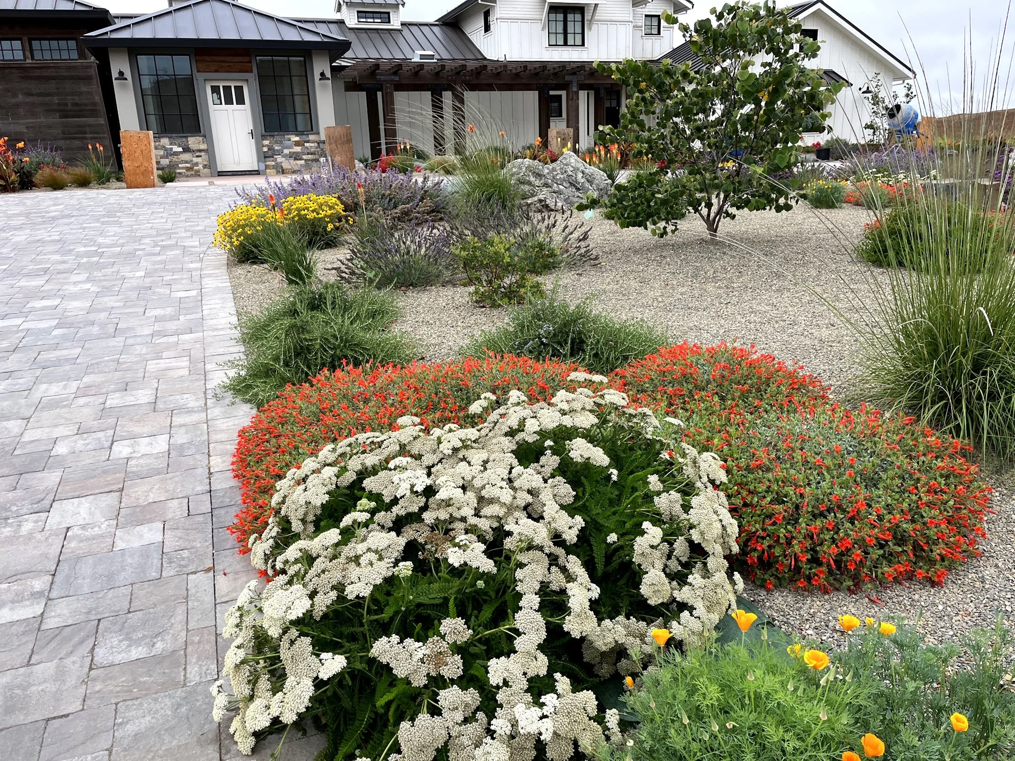 In North Napa, a fun design for a small front yard came out nicely, with locally sourced stone walls and a small vineyard that frames the walkway to the front door (pictured here). Closer to the house is a small sitting area and colorful plantings like White Carpet Rose and Mexican Sage. Once the vines grow in, they will have a lovely green screen from the street and some wine to enjoy as well!