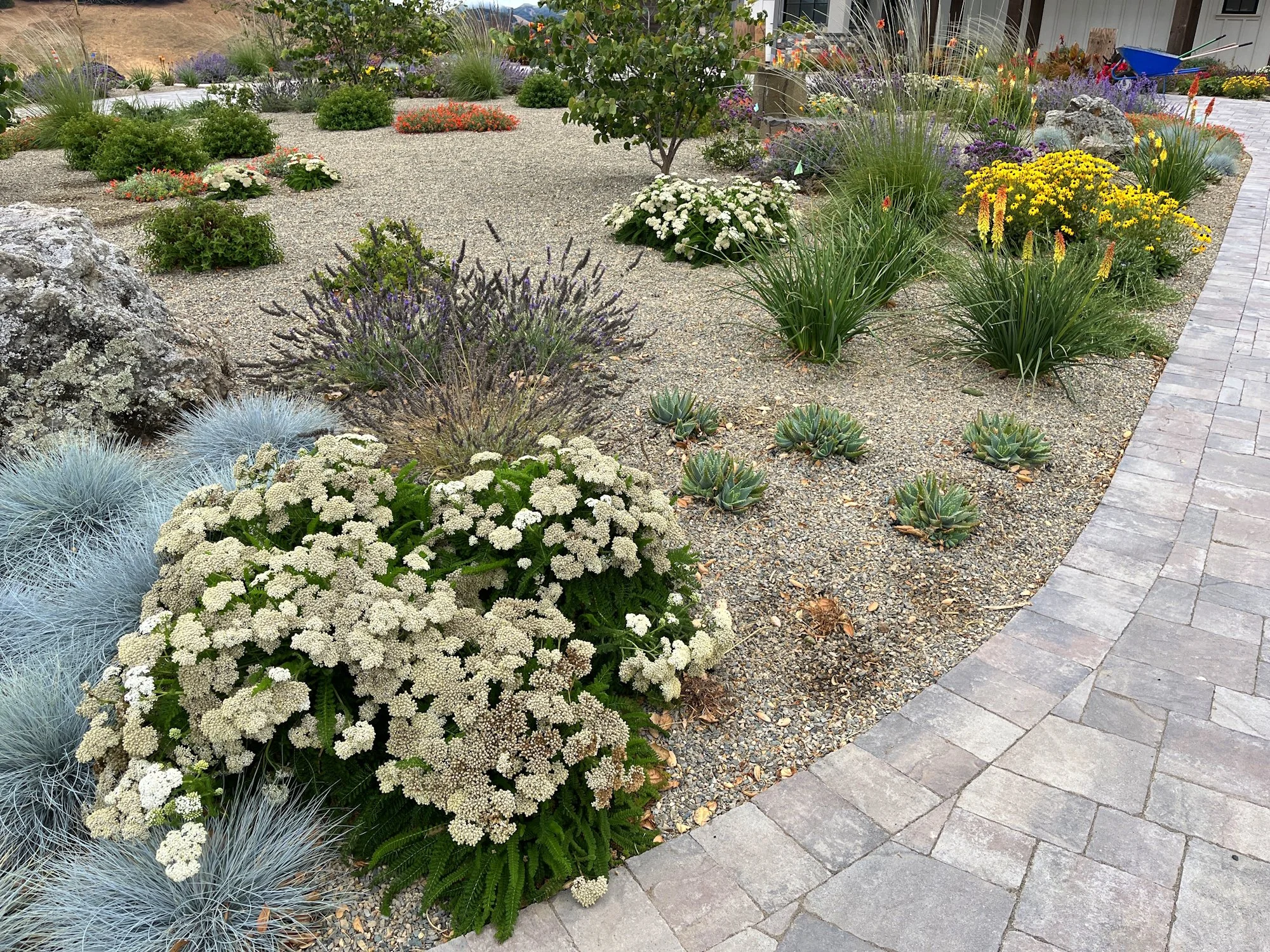 Quite a few of Rhyne Designs’ projects have been installed recently, all over the Bay Area from Petaluma to Napa to Livermore. I am really excited to see the front yard of this home near Petaluma installed and thriving (pictured below). Inspired by a client with a lot of planting knowledge, we designed a fun combination of plant textures and flowers using California natives and other drought tolerant species from the Mediterranean. These plants were selected for high habitat value and are arranged in clusters to complement some beautiful boulders and maintain open gravel spaces in between for fire safety.