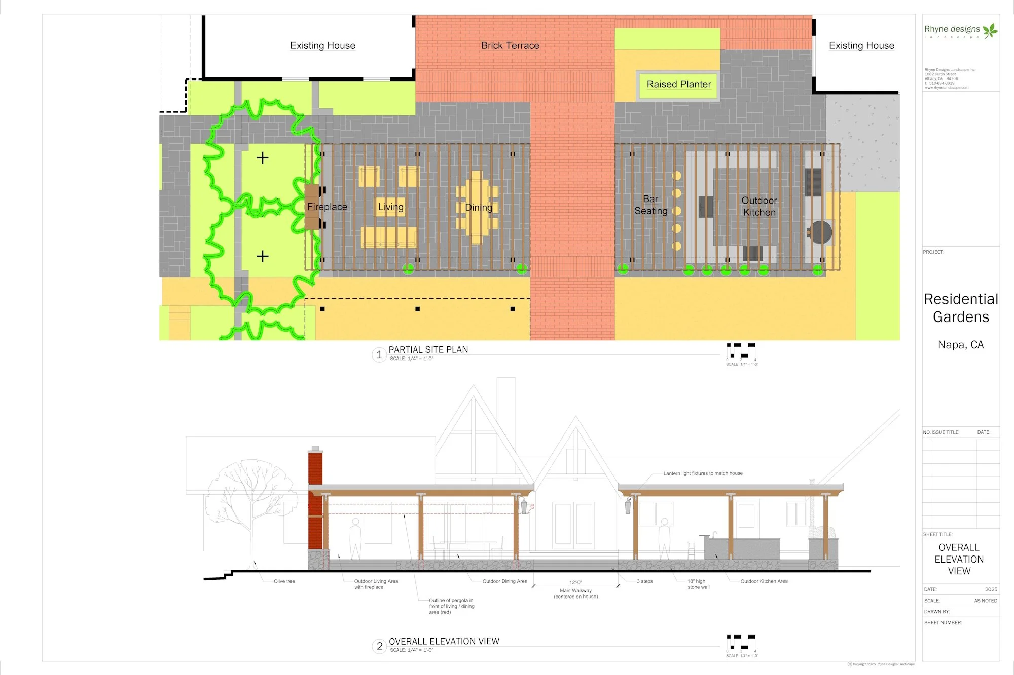 On the other side of Napa a very exciting project is underway, transforming a neglected backyard area between three buildings into a unifying outdoor space for the family and guests to gather. The design centers on two covered outdoor living spaces with a full outdoor kitchen, dining area, and sitting area with a brick fireplace. Working with some unique Tudor style architecture, this landscape design uses simple structures that don’t compete with the house and brick paving accents that tie in with the existing materials without getting too historical, as shown in the drawing below.