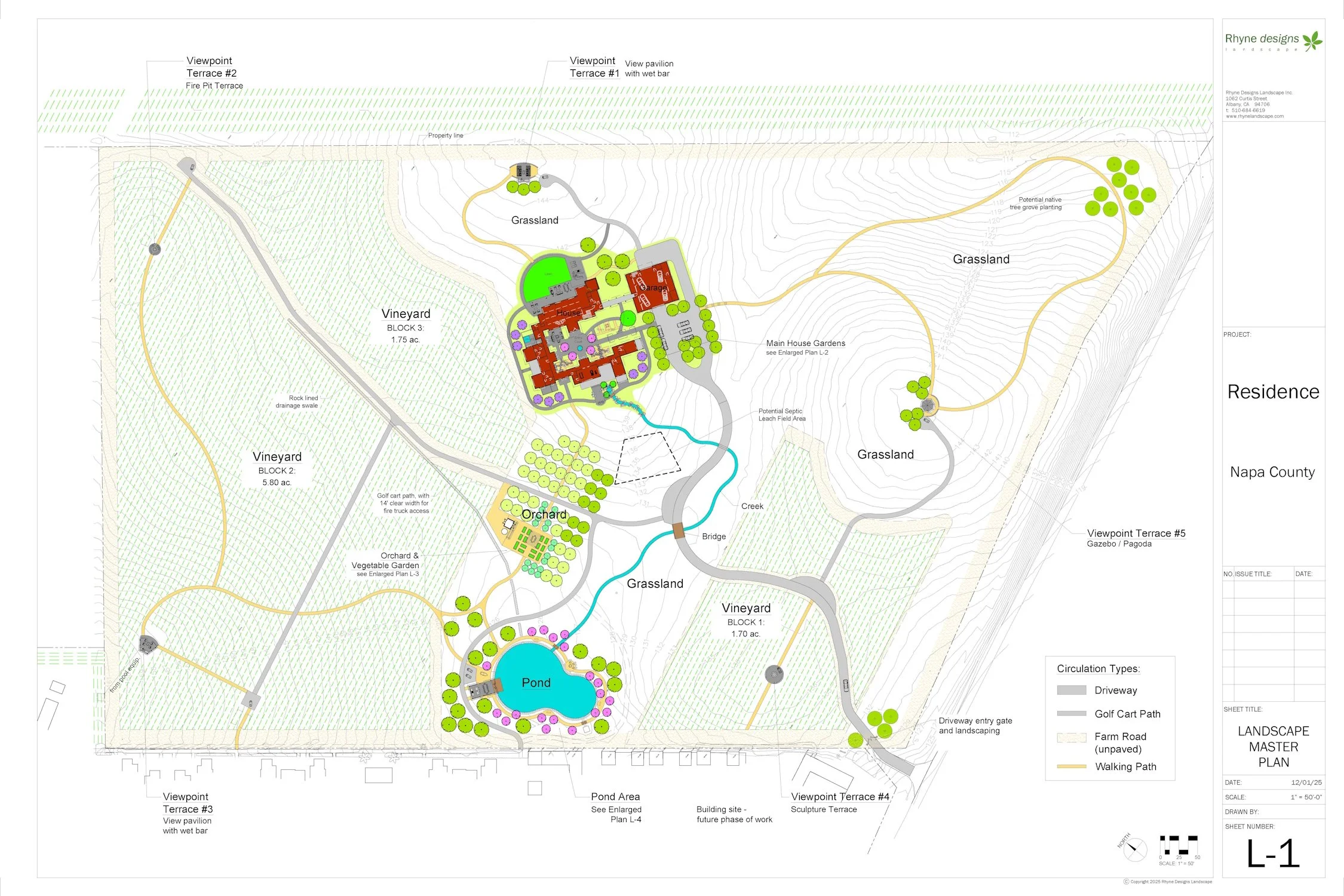 Among the various projects currently on the digital drawing boards at Rhyne Designs are two exciting residential estates in Napa County. One involves a large property of rolling hills and hay fields that we have been master planning in collaboration with an Architect. The property will have a new house that stretches out to enclose a very nice courtyard space and orient various rooms to different views. The rest of the property will be developed with several blocks of vineyards, an orchard and vegetable farm, a pond linked to the house with a seasonal stream, as well as some open grasslands. Worked in among these elements is a network of pathways and some fun sitting areas, each with a unique character ranging from a classic gazebo to a very modern outdoor living room with amazing views. This will be built in phases and the detailed design is ongoing, with some construction starting later this year.
