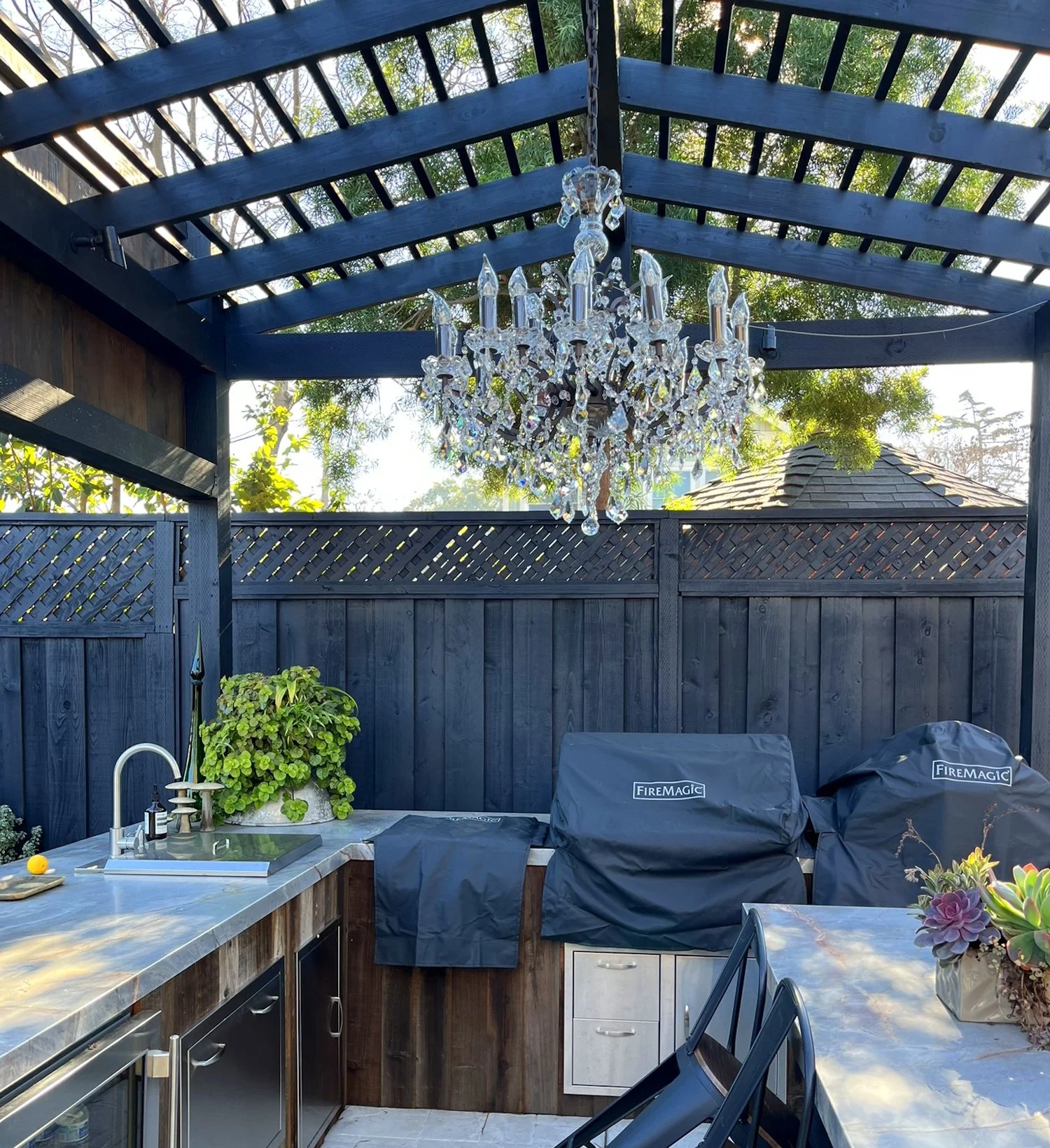 Lastly, in Livermore we worked with a client with a keen design sense to convert a small backyard into a fantastic series of outdoor rooms. Rhyne Designs was brought in to help add some Napa Valley style to the landscape and tie into Livermore’s growing wine country scene. The backyard improvements include an outdoor living area framed by a fireplace on one end and space for projecting movies on the other. Next to this is an outdoor kitchen with a peaked-roof trellis and fun chandelier. Beyond that are raised vegetable beds, a wood Japanese soaking tub and perimeter screen plantings. All the paving materials and paint colors were carefully coordinated with the remodelling of the house to have an elegant color scheme of faded black, rusted steel and touches of warm ivory white and dark green.